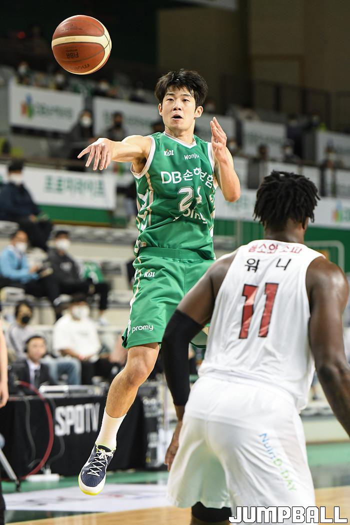 [점프볼=원주/박상혁 기자] 18일 원주종합체육관에서 열린 2020-2021 현대모비스 프로농구 원주 DB와 서울 SK의 경기, DB 김영훈이 골밑에 있는 동료에게 패스를 시도 하고 있다.