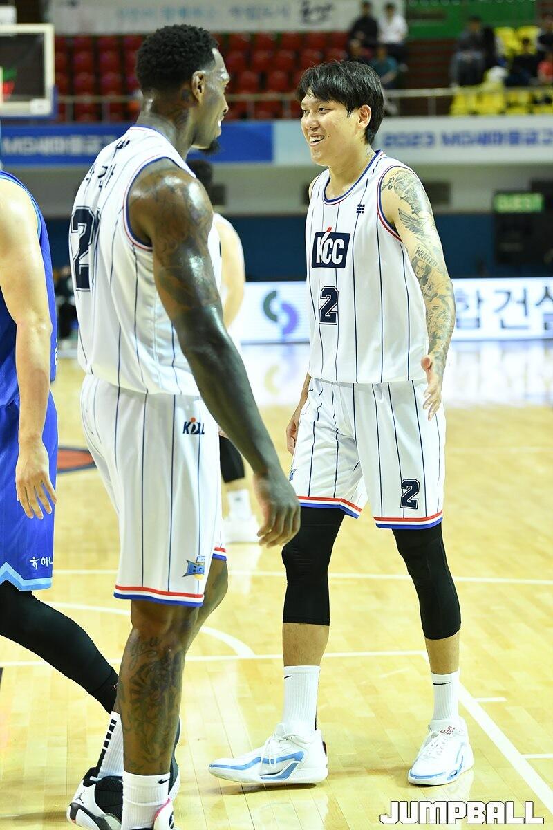 9일 군산월명체육관에서 열린 2023 MG새마을금고 KBL 컵대회 한국가스공사와 KCC의 예선 경기, KCC 최준용과 라건아가 공격을 성공하고 세레머리를 펼치고 있다. [점프볼=군산/유용우 기자]
