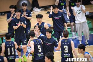 31일 성균관대학교 자연과학캠퍼스 수성관에서 열린 2023 KUSF 대학농구 U-리그 성균관대와 단국대의 경기, 단국대 선수단이 환호하고 있다.