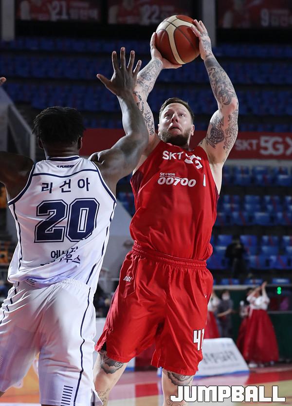 [점프볼=잠실/백승철 기자] 11일 오후 잠실학생체육관에서 열린 2020-2021 현대모비스 프로농구 서울 SK와 전주 KCC의 경기, SK 닉 미네라스가 슛을 시도하고 있다.