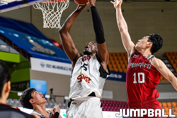 [점프볼=상주/박상혁 기자] 12일 경상북도 상주시 상주실내체육관에서 열린 '2021 MG새마을금고 KBL컵 대회' 부산 KT와 안양 KGC인삼공사의 경기, KT 캐디 라렌이 골밑슛을 시도하고 있다.