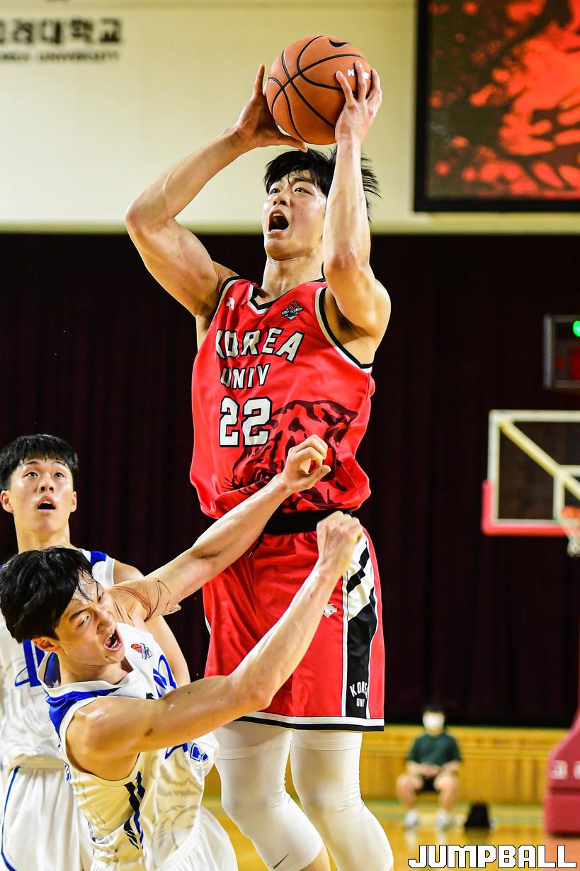 18일 고려대 화정체육관에서 열린 2022 KUSF 대학농구 U-리그 고려대와 단국대 경기, 고려대 여준석이 골밑에서 슛을 시도하고 있다.