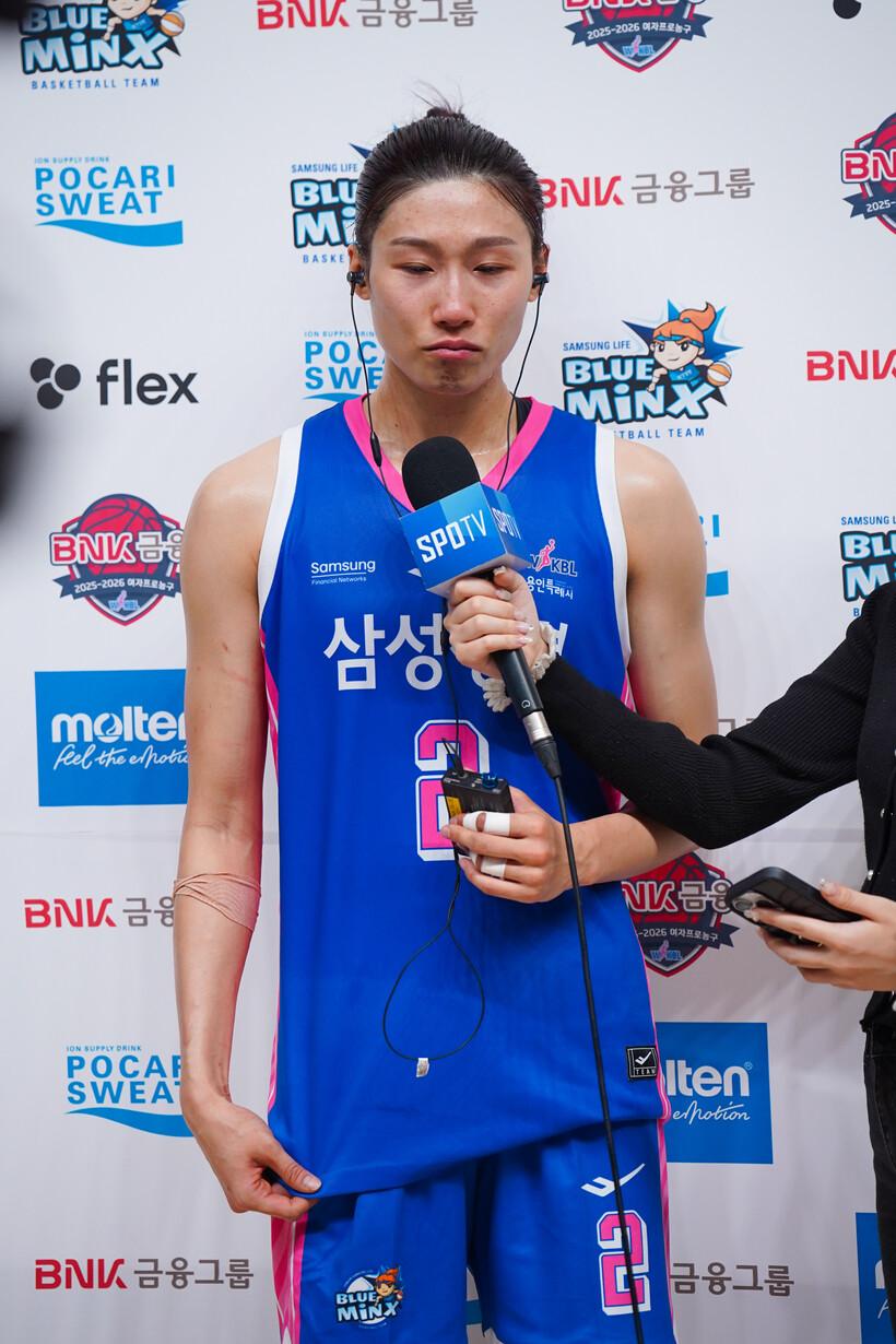 용인 삼성생명 이해란은 20일 용인체육관에서 열린 BNK금융 2025~2026 여자프로농구 인천 신한은행과의 경기에서 연장전 포함 43분 30초 동안 32점 12리바운드를 기록했다. 팀도 79-74로 짜릿한 승리를 챙겼다.