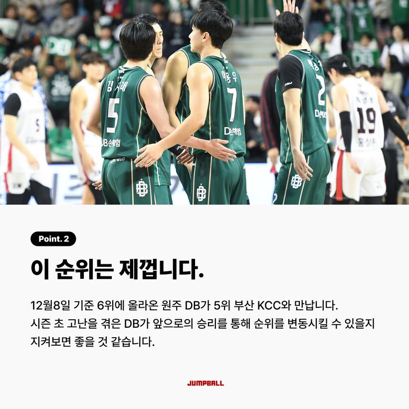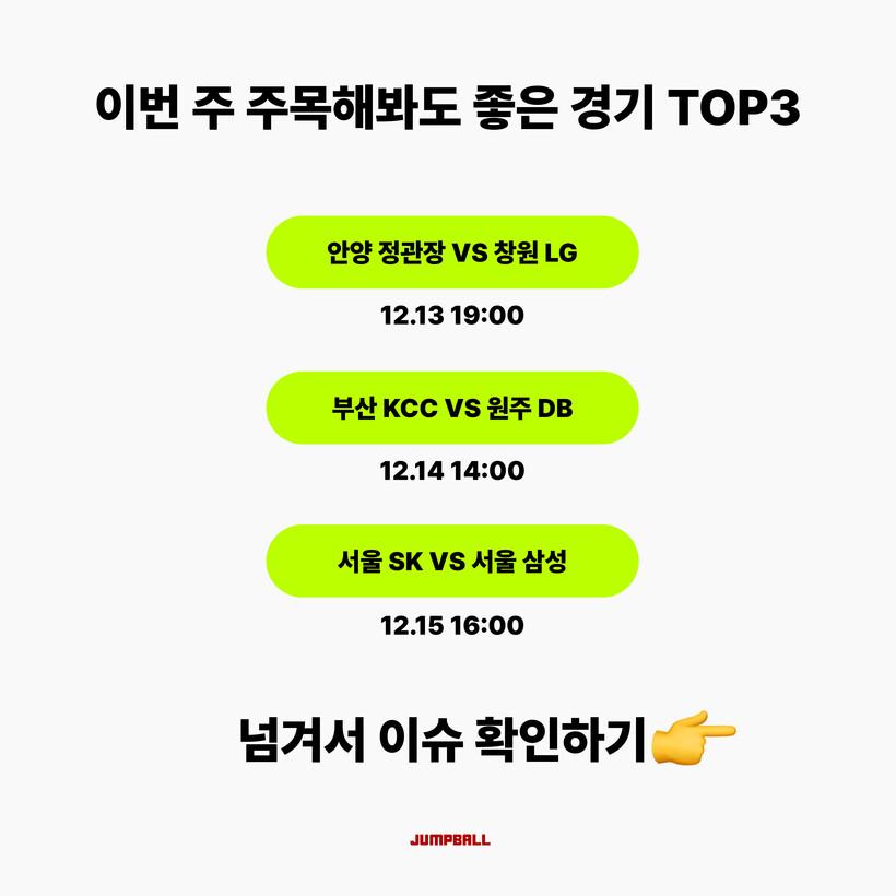 [점프볼=박예승 인터넷기자] 상승세의 DB는 이번 주 순위 상승을 노리고, 원정 연전에 돌입한 삼성은 시즌 2번째 S더비를 치릅니다. 올스타 팬 투표도 화제인데요! 이번주 크블 팬들이라면 꼭 췌크해야 할 이슈들을 정리했습니다!