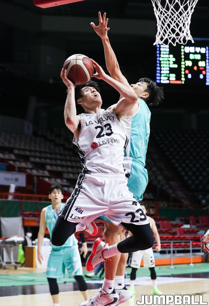 [점프볼=윤민호 기자]24 사직실내체육관에서 열린 2020-2021 현대모비스 프로농구 부산 KT 창원 LG 경기에서 LG 최승욱이 KT 김영환의 수비를 피해 슛을 하고 있다.