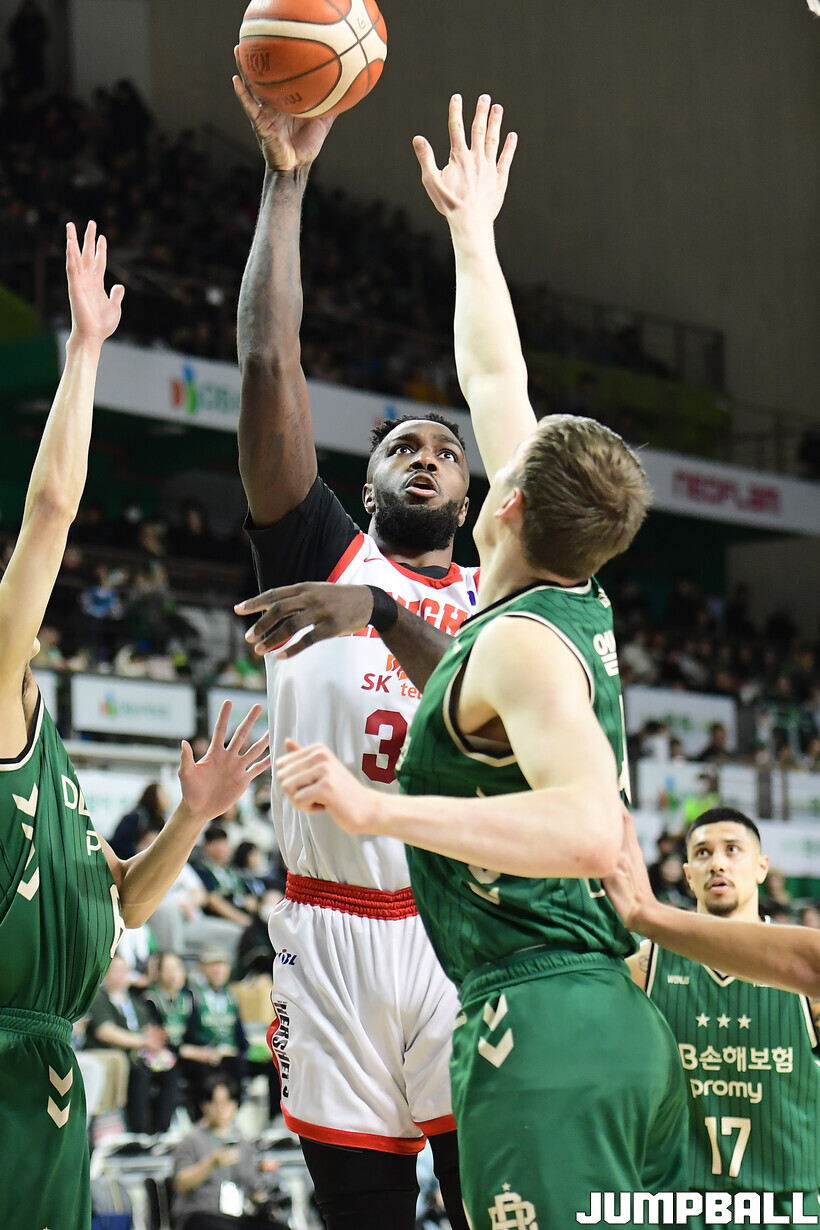 [점프볼=원주/박상혁 기자] 8일 원주 DB 프로미 아레나에서 열린 2025-2026 LG전자 프로농구 원주 DB와 서울 SK의 경기, SK 자밀 워니가 슛을 시도하고 있다.