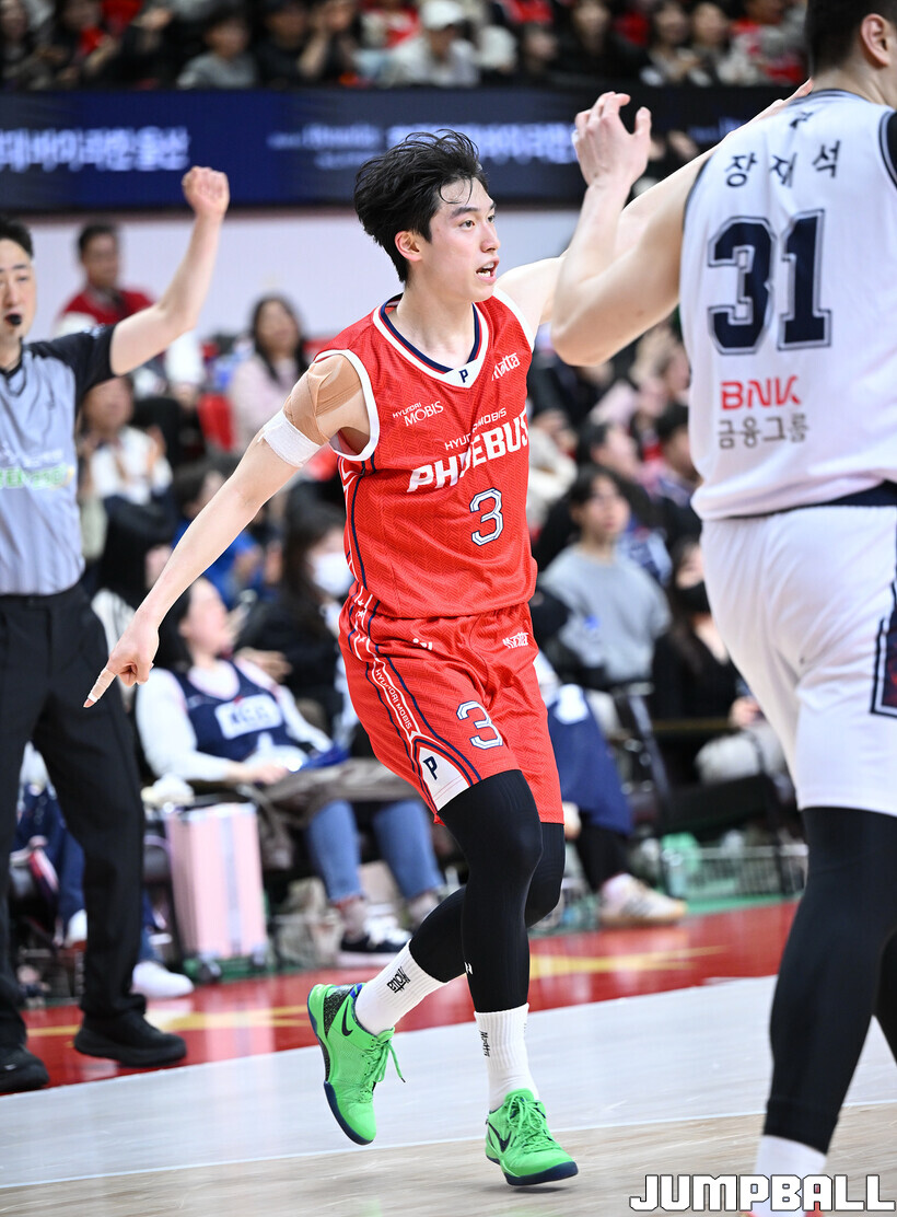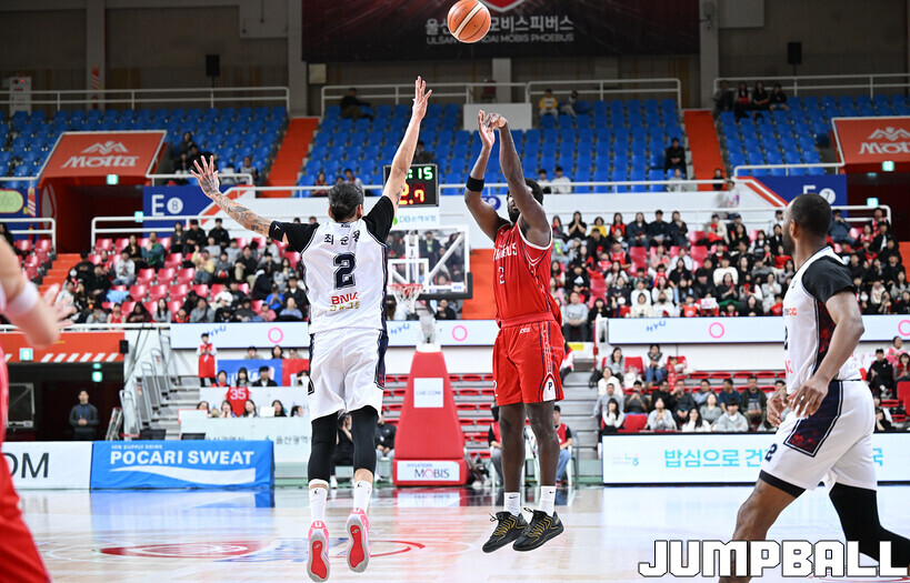 [점프볼=울산/문복주 기자] 울산 현대모비스는 15일 울산동천체육관에서 벌어진 2025-2026 LG전자 프로농구 정규시즌 홈경기에서 부산 KCC를 접전 끝에 85–74로 물리치고 승리를 했다.