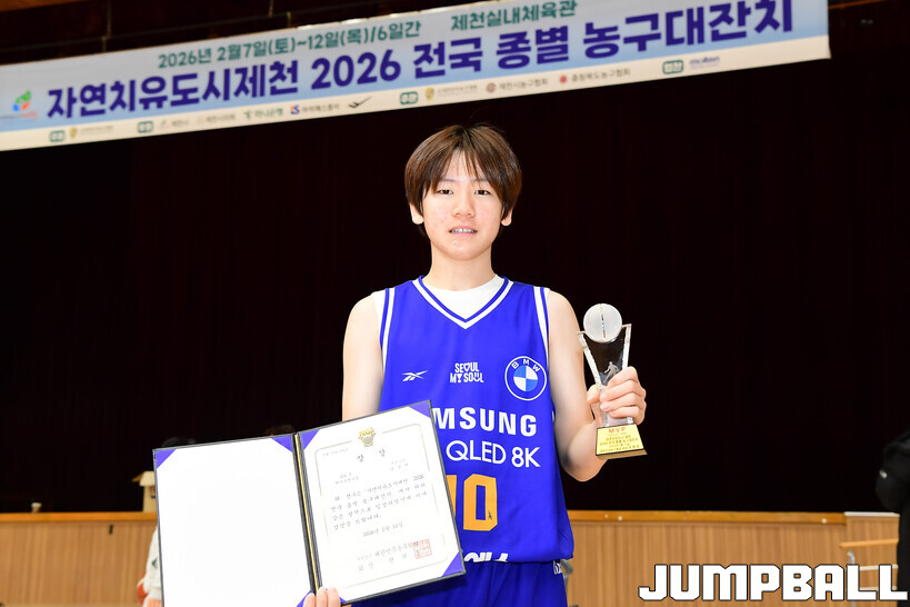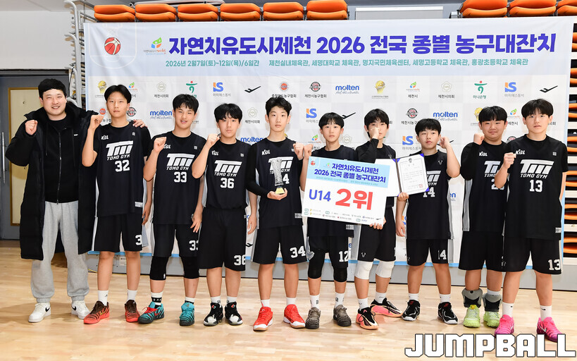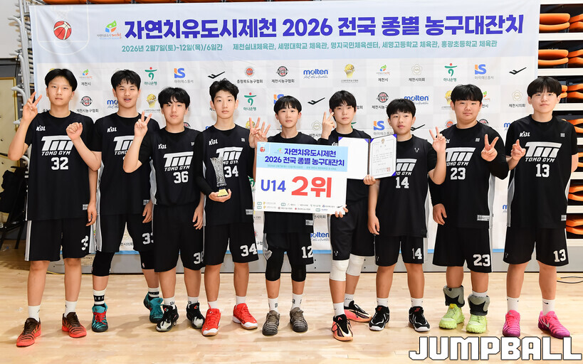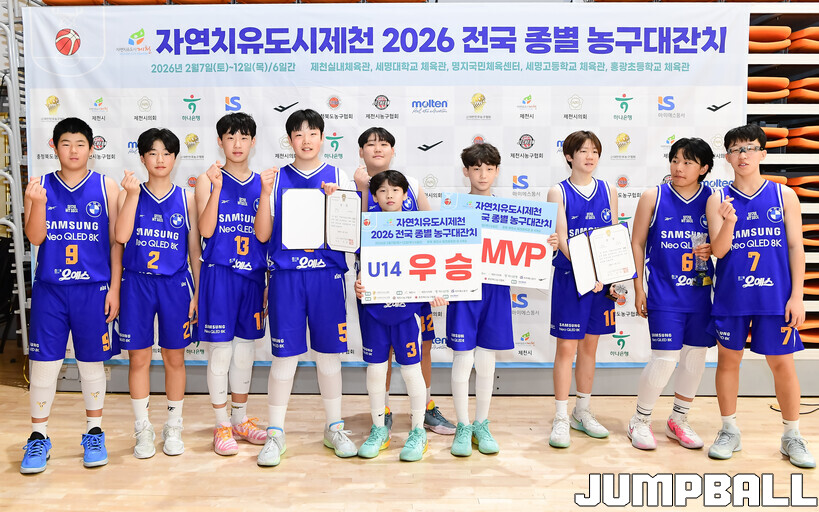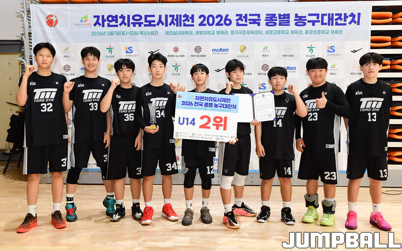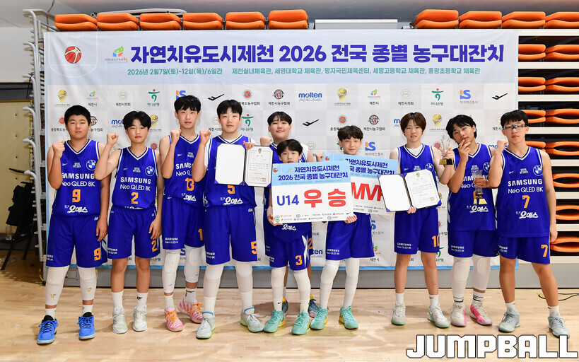 [점프볼=제천/박상혁 기자] 10일 충북 제천체육관에서 열린 자연치유도시 제천 2026 전국 종별 농구대잔치 4일차 U14부 아산삼성과 동대문토모의 결승전 경기, 조은준과 안경서가 각각 15점과 11점을 올리며 활약한 아산삼성이 권시훈과 윤도원이 24점을 합작한 동대문토모에 42-30으로 승리하며 U14부 우승을 차지했다.