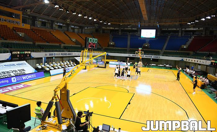 [점프볼=청주/문복주 기자] 17일 청주체육관에서 열린 '2020 우리은행 박신자컵 서머리그' 대학선발과 신한은행의 경기, 무관중으로 경기시작 점프볼을 하고 있다