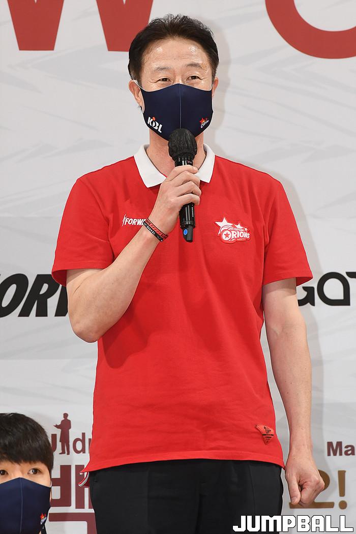 [점프볼=고양/박상혁 기자] 4일 고양체육관에서 2020-2021시즌 오리온 온택트 출정식 및 팬미팅이 열렸다. 오리온 강을준 감독이 팬들에게 인사를 드리고 있다.