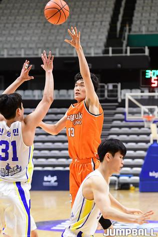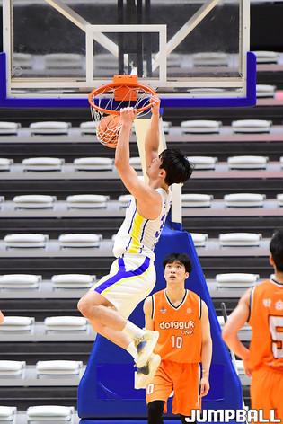 [점프볼=수원/박상혁 기자] 4일 서수원칠보체육관에서 열린 2021 KUSF 대학농구 U리그 연세대와 동국대의 경기, 연세대 이정현이 환호하고 있다.