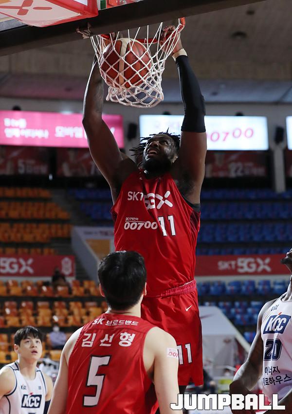 [점프볼=잠실/백승철 기자] 11일 오후 잠실학생체육관에서 열린 2020-2021 현대모비스 프로농구 서울 SK와 전주 KCC의 경기, SK 자밀 워니가 덩크를 하고 있다.