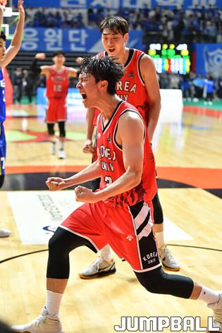 28일 고양실내체육관에서 열린 고려대와 연세대의 2022 정기전, 고려대 주희정 감독이 박무빈의 플레이에 만족감을 나타내고 있다. [점프볼=고양/유용우 기자]