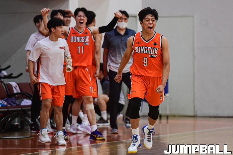 3일 동국대 서울캠퍼스 체육관에서 열린 2022 KUSF 대학농구 U-리그 동국대와 연세대의 경기, 동국대 백승엽이 3점슛을 성공시킨 후 포효하고 있다.
