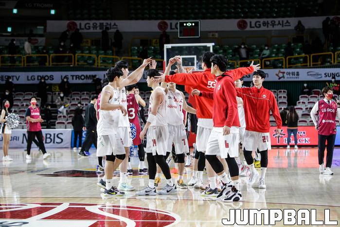 [점프볼=정을호 기자] 9 창원실내체육관에서 열린 2020-2021 현대모비스 프로농구 창원 LG 서울 SK 경기, SK가 연장 접전끝에 승리 후 하이파이브를 나누고 있다.