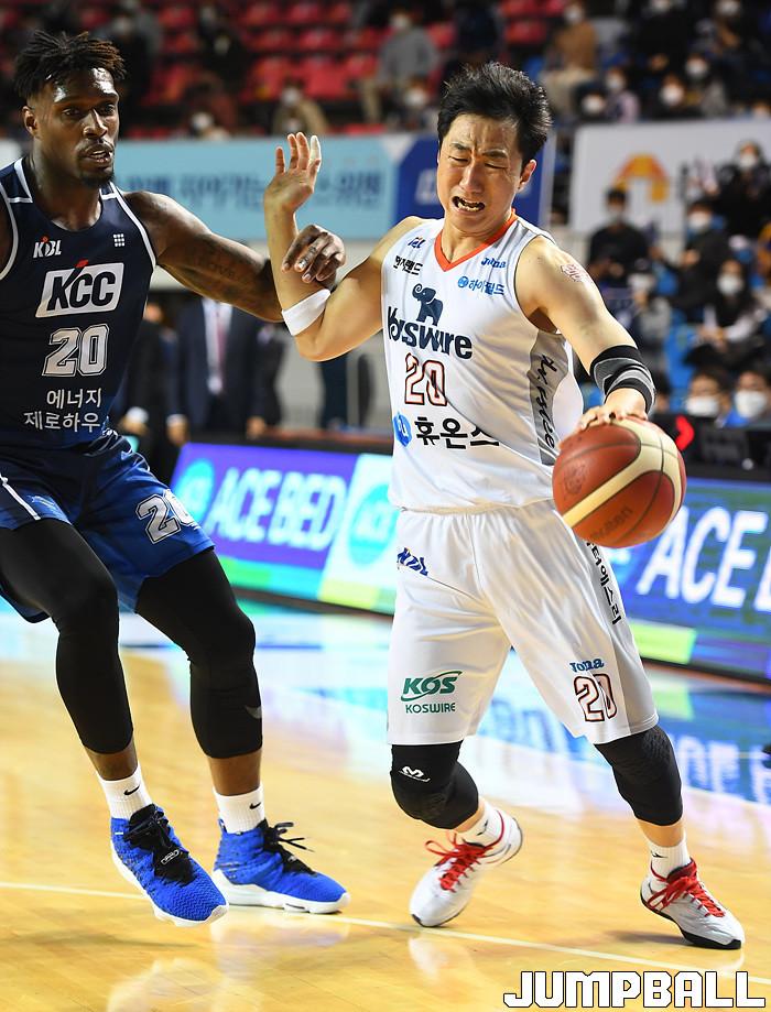 [점프볼=전주/문복주 기자] 14일 전주실내체육관에서 열린 2020-2021 현대모비스 프로농구 전주 KCC와 인천 전자랜드의 경기, 전자랜드 정영삼의 KCC 라건아의 수비를 뿌리치며 괴로운 표정을 짓고 있다.