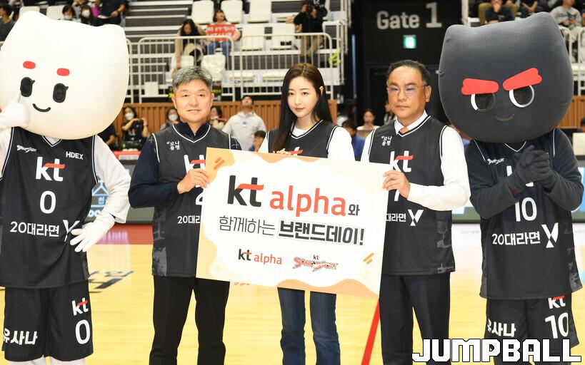 [점프볼=수원/박상혁 기자] 11일 수원 KT 소닉붐 아레나에서 열린 2023-2024 정관장 프로농구 수원 KT와 울산 현대모비스의 경기, KT 알파 조성수 대표, KT 알파 커머스사업 부문장 이정호 상무, 죠스진 모델 배우 김사랑이 KT 알파브랜드 데이 기념 촬영을 하고 있다.