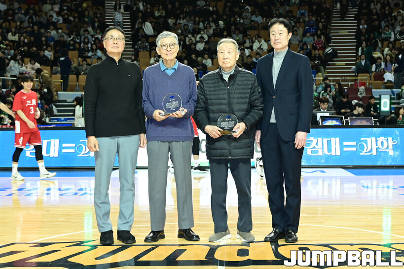 감사패의 주인공인 이인표, 김인건 선생은 옛 추억에 잠겼다. “삼성전자와 현대전자의 라이벌 구도가 흥미로웠어요. 스카우트 경쟁이 치열했고, 스타 선수들이 맞대결하면서 많은 관심을 받았죠. 그게 프로농구가 출범하는 데에 밑거름이 됐다고 생각합니다. 경기장에 못 들어온 팬도 많던 시절이었으니까요.” 이인표 선생의 회고다.