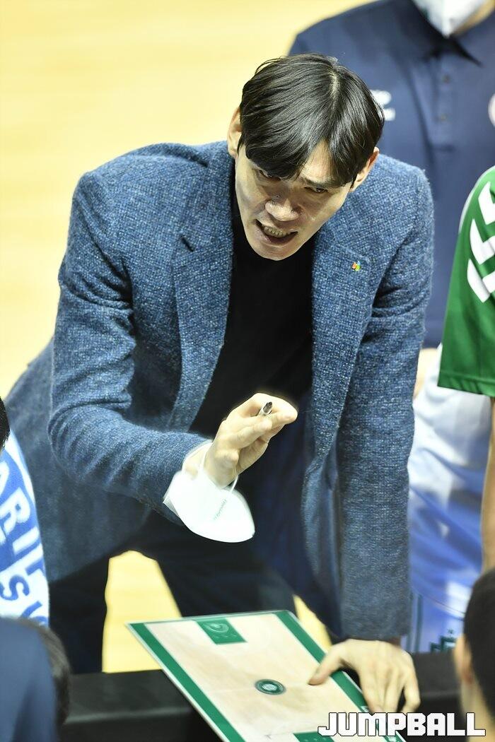 21일 잠실실내체육관에서 열린 2022-2023 SKT 에이닷 프로농구 서울 삼성과 원주 DB의 경기, DB 김주성 감독대행이 작전을 지시하고 있다. [점프볼=잠실/유용우 기자]