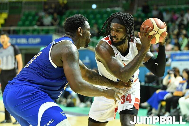 8일 군산월명체육관에서 열린 2023 MG새마을금고 KBL 컵대회 SK와 삼성의 예선 경기, 삼성 코비 코넌과 SK 자밀 워니가 공수대결을 벌이고 있다. [점프볼=군산/유용우 기자]