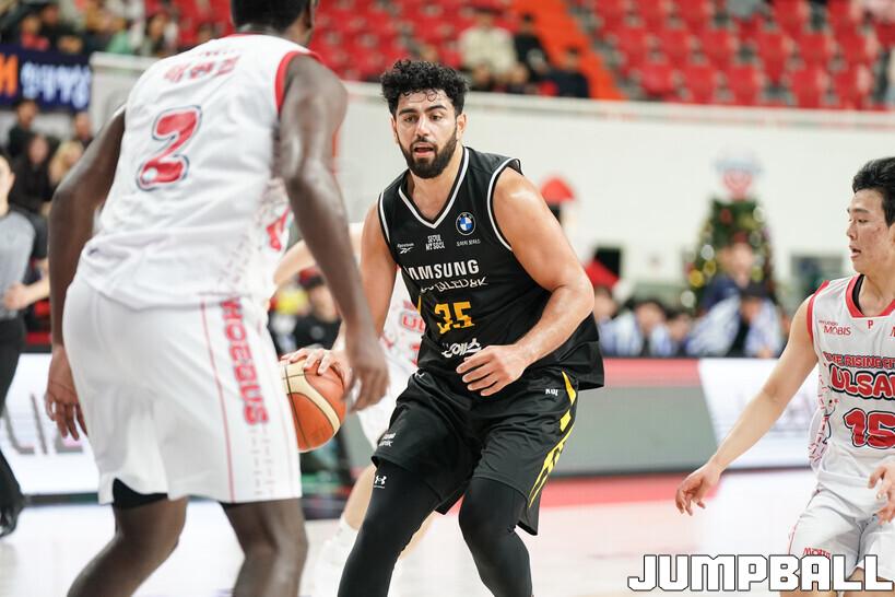 서울 삼성은 13일 울산동천체육관에서 열린 2025~2026 LG전자 프로농구 울산 현대모비스와 원정 경기에서 84-61로 이겼다. 3쿼터까지 52-53으로 뒤졌던 삼성은 4쿼터에서 3점슛을 중심으로 득점을 폭발시켜 2연패에서 벗어났다.