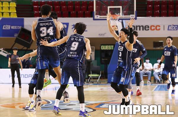 [점프볼=군산/백승철 기자] 10일 오후 군산 월명체육관에서 열린 2020-2021 현대모비스 프로농구 전주 KCC와 인천 전자랜드의 경기, KCC 선수들이 경기 종료 후 환호하고 있다.
