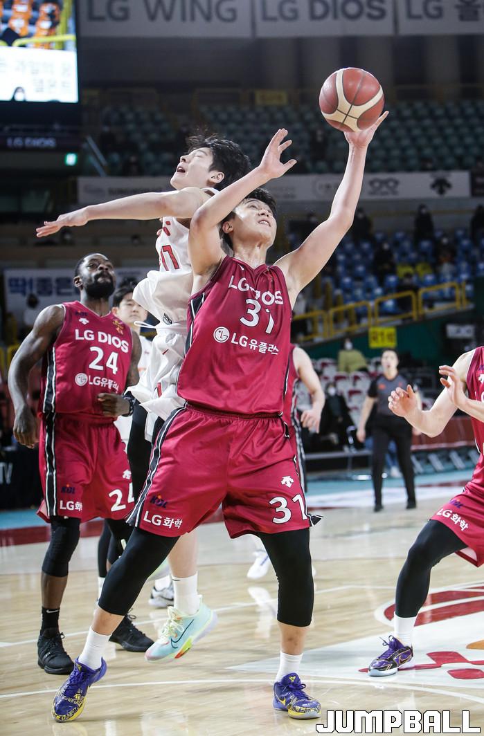 [점프볼=정을호 기자] 9 창원실내체육관에서 열린 2020-2021 현대모비스 프로농구 창원 LG 서울 SK 경기, LG 박정현이 리바운드를 성공하고 있다.