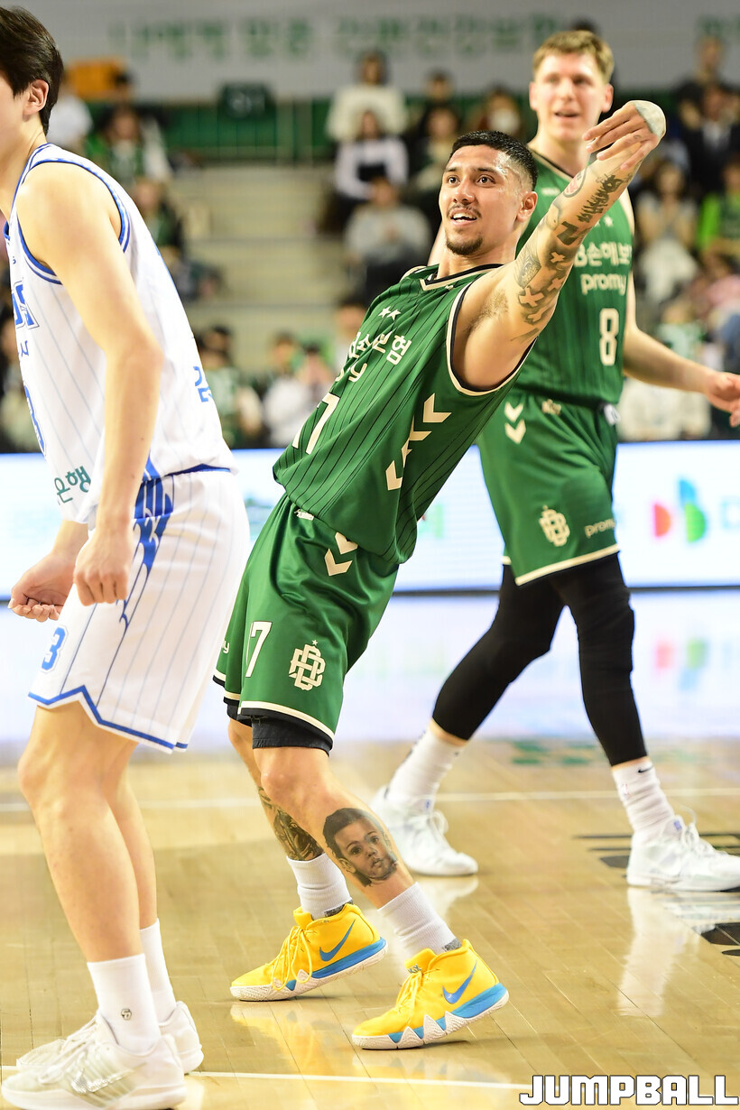 [점프볼=원주/박상혁 기자] 22일 원주 DB 프로미 아레나에서 열린 2025-2026 LG전자 프로농구 원주 DB와 대구 한국가스공사의 경기, DB 이선 알바노가 버저비터를 시도한 후 림을 바라보고 있다.
