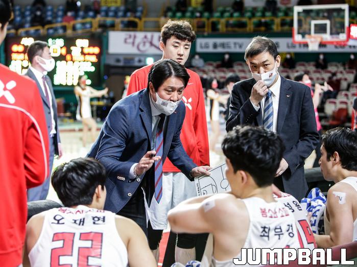 [점프볼=정을호 기자] 9 창원실내체육관에서 열린 2020-2021 현대모비스 프로농구 창원 LG 서울 SK 경기, SK 문경은 감독이 작전지시를 시도하고 있다.