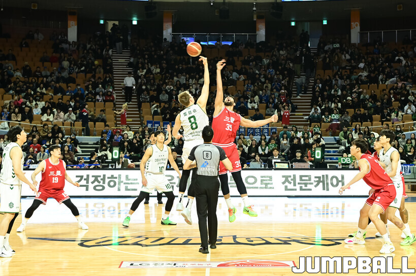 [점프볼=잠실/박상혁 기자] 7일 잠실체육관에서 열린 2025-2026 LG전자 프로농구 서울 삼성과 원주 DB의 경기, 점프볼로 경기가 시작되었다.