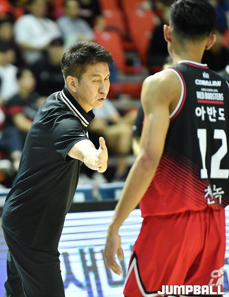 9일 군산월명체육관에서 열린 2023 MG새마을금고 KBL 컵대회 정관장과 현대모비스의 예선 경기, 정관장 김상식 감독이 아반도를 격려하고 있다. [점프볼=군산/유용우 기자]