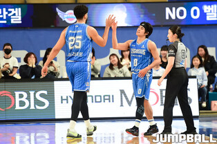 [점프볼=대구/박상혁 기자] 14일 대구체육관에서 열린 2025-2026 LG전자 프로농구 대구 한국가스공사와 울산 현대모비스의 경기, 한국가스공사 김준일이 보트라이트와 하이파이브를 하고 있다.