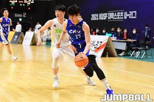 [점프볼=수원/박상혁 기자] 25일 서수원칠보체육관에서 열린 2021 KUSF 대학농구 U-리그 한양대와 단국대 경기, 한양대 김민진이 패스를 시도하고 있다.