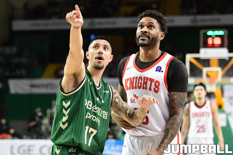 [점프볼=원주/박상혁 기자] 8일 원주 DB 프로미 아레나에서 열린 2025-2026 LG전자 프로농구 원주 DB와 서울 SK의 경기, DB 이선 알바노와 SK 대릴 먼로가 비디오 판독을 보면서 소유권을 주장하고 있다.