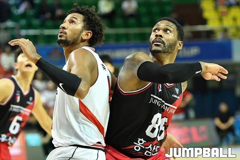 9일 군산월명체육관에서 열린 2023 MG새마을금고 KBL 컵대회 정관장과 현대모비스의 예선 경기, 현대모비스 알루마와 정관장 먼로가 리바운드를 준비하고 있다. [점프볼=군산/유용우 기자]