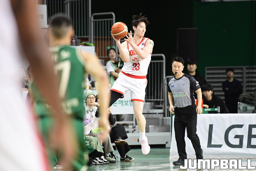 [점프볼=원주/박상혁 기자] 8일 원주 DB 프로미 아레나에서 열린 2025-2026 LG전자 프로농구 원주 DB와 서울 SK의 경기, SK 김형빈이 사이드 라인 밖으로 나가는 볼을 살려내고 있다.