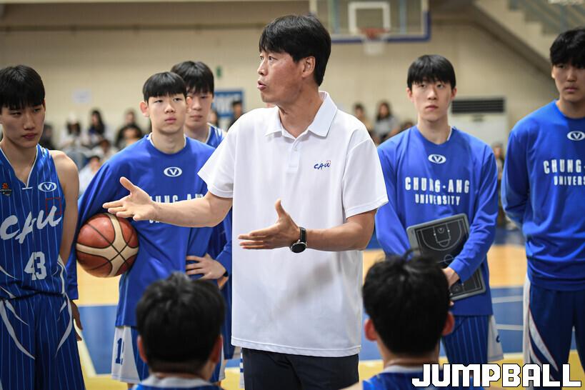 [점프볼=안성/박상혁 기자] 7일 중앙대 안성캠퍼스 체육관에서 열린 2023 KUSF 대학농구 U-리그 중앙대와 고려대의 경기, 중앙대 양형석 감독이 작전 지시를 하고 있다.