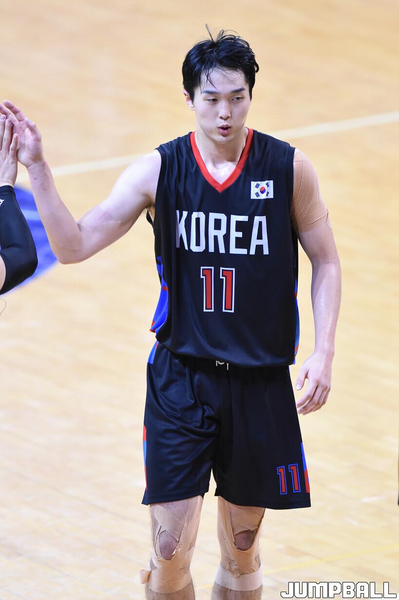 21일 연세대학교 신촌캠퍼스 체육관에서 열린 제46회 한일 대학선발 농구대회 한국 남자 대학선발과 일본 남자 대학 선발의 3차전, 한국 남대 선발 양준이 하이파이브를 하고 있다.