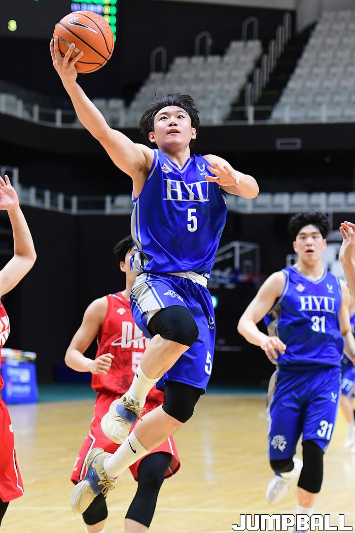 [점프볼=수원/박상혁 기자] 25일 서수원칠보체육관에서 열린 2021 KUSF 대학농구 U-리그 한양대와 단국대 경기, 한양대 김민진이 레이업슛을 시도하고 있다.