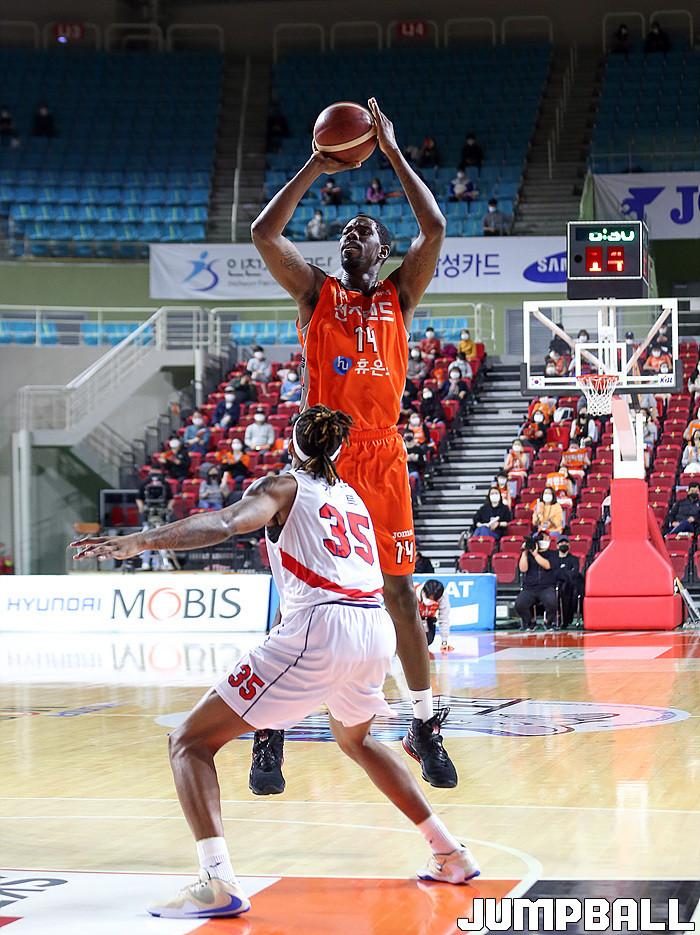 [점프볼=인천/한명석 기자] 1일 인천삼산체육관에서 열린 2020-2021 현대모비스 프로농구 인천전자랜드와 울산현대모비스와의 경기, 인천 전자랜드 헨리 심스 선수가 미들 슛을 시도하고 있다.