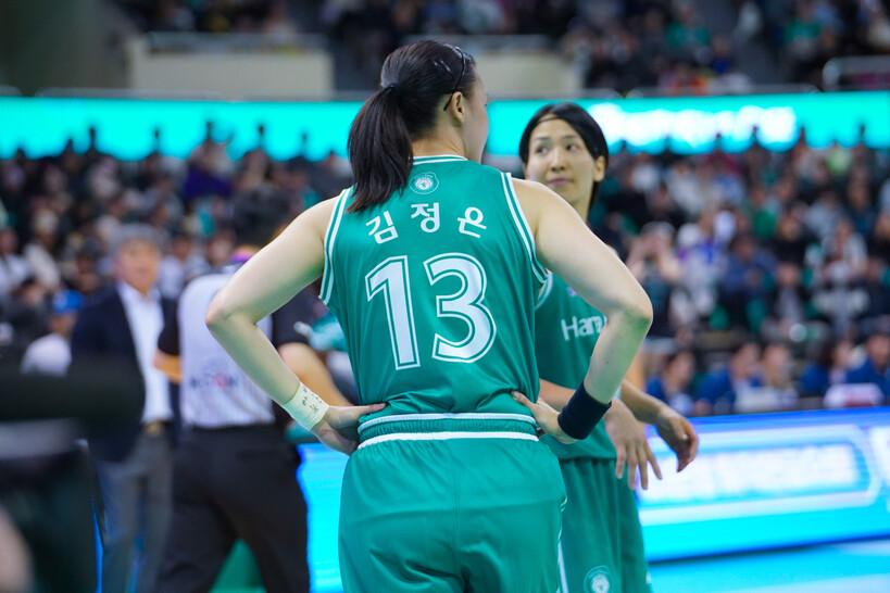 부천 하나은행 김정은은 13일 부천체육관에서 열린 BNK금융 2025~2026 여자프로농구 용인 삼성생명과의 맞대결에서 13점 7리바운드로 활약, 하나은행의 74-67 승리를 이끌었다.