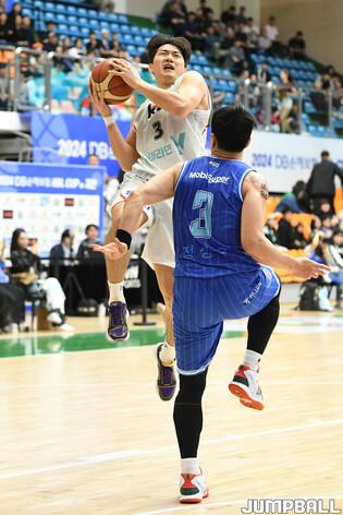 [점프볼=제천/유용우 기자] 12일 제천체육관에서 열린 2024 DB손해보험 KBL 컵대회 in 제천, 수원 KT와 대구 한국가스공사의 준결승, 한국가스공사 정성우가 KT 수비 진영을 돌파하고 있다.