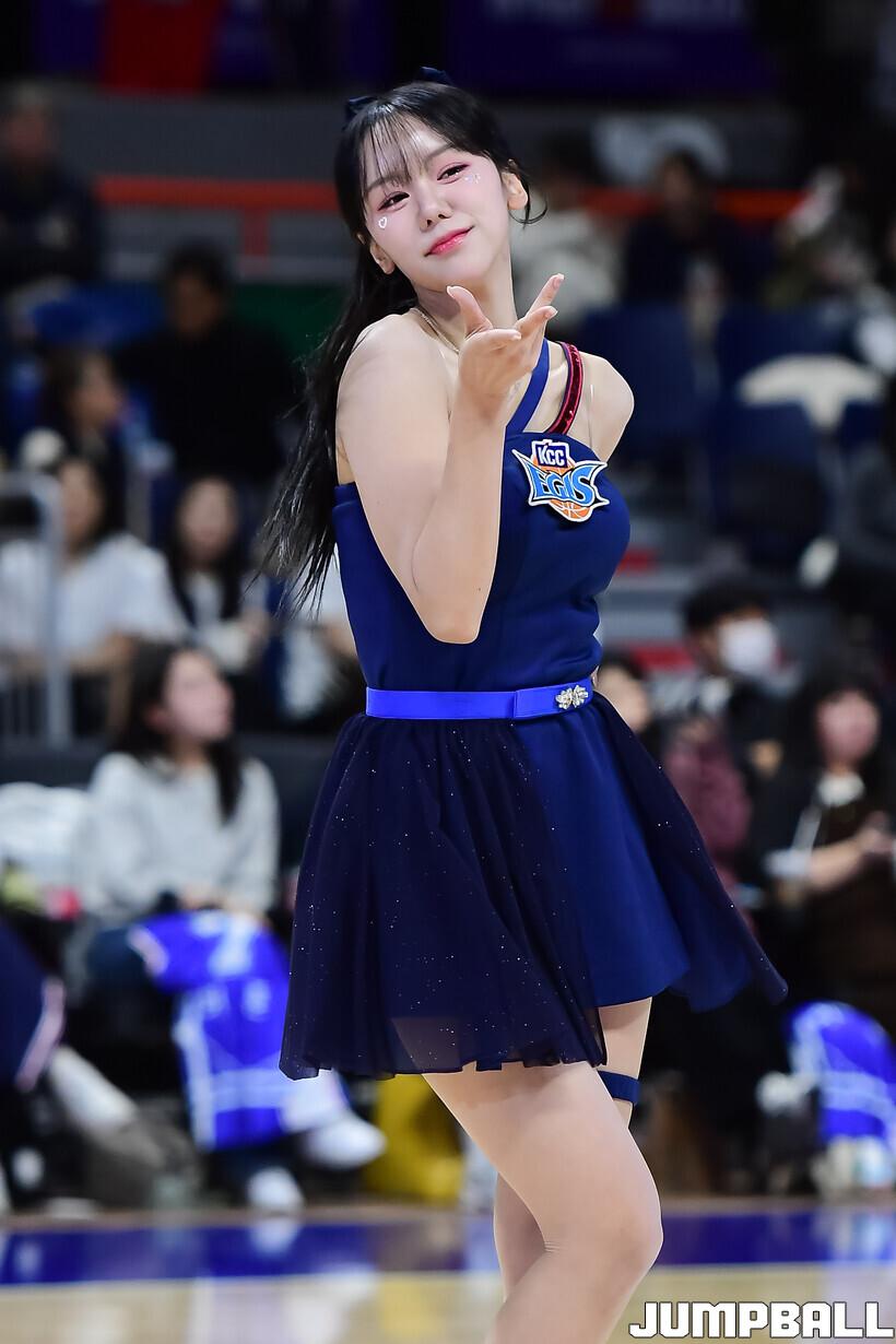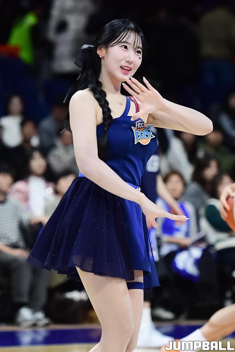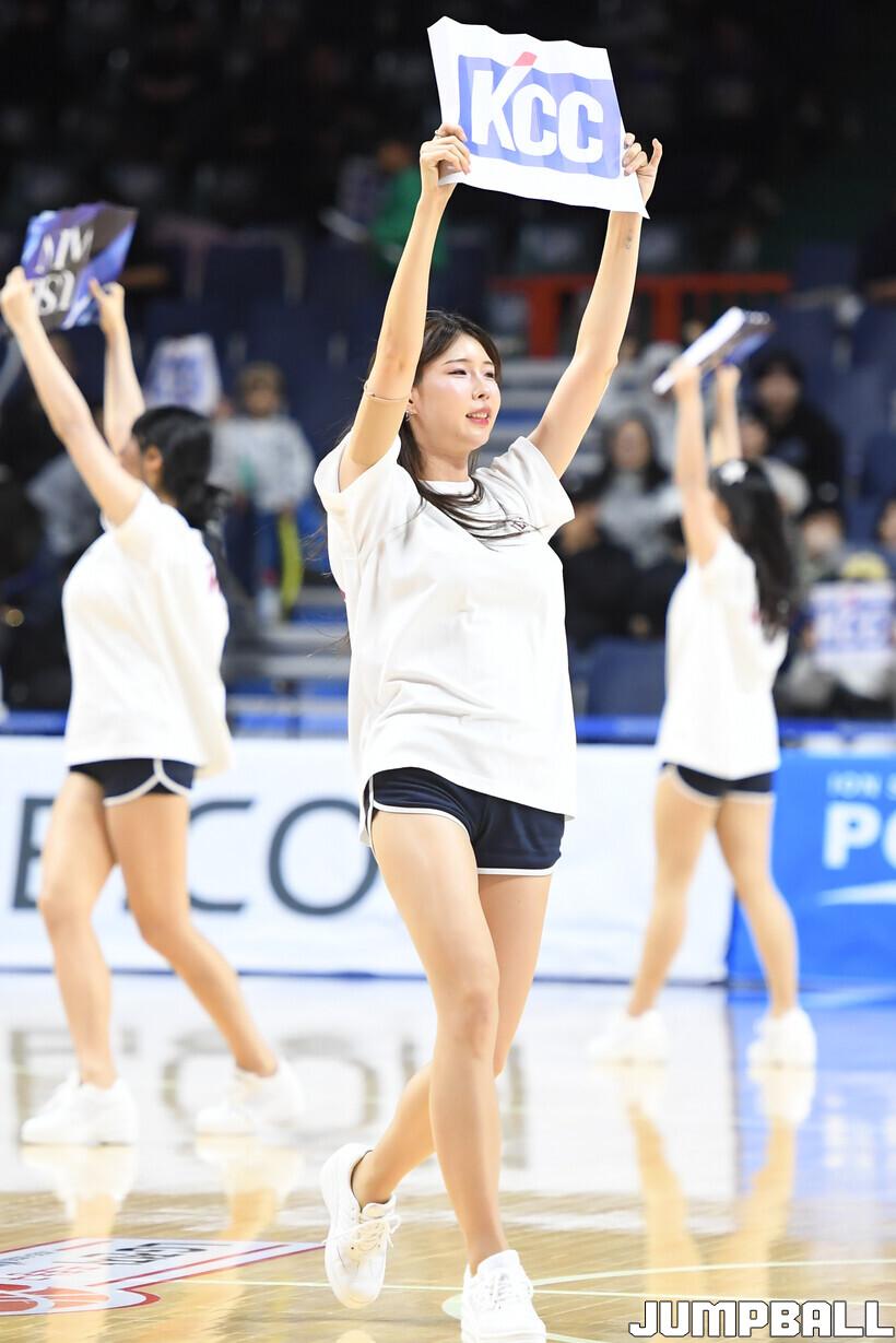 [점프볼=부산/박상혁 기자] 28일 부산사직체육관에서 열린 2025-2026 LG전자 프로농구 부산 KCC와 울산 현대모비스의 경기, KCC 치어리더가 승리를 위해 팬들과 함께 응원을 하고 있다.