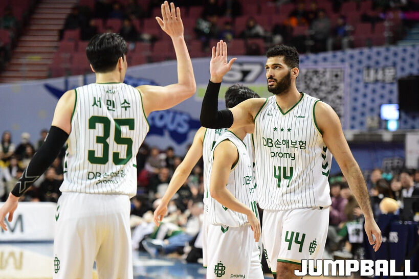 [점프볼=잠실/박상혁 기자] 7일 잠실체육관에서 열린 2025-2026 LG전자 프로농구 서울 삼성과 원주 DB의 경기, DB 무스타파와 서민수가 하이파이브를 하고 있다.
