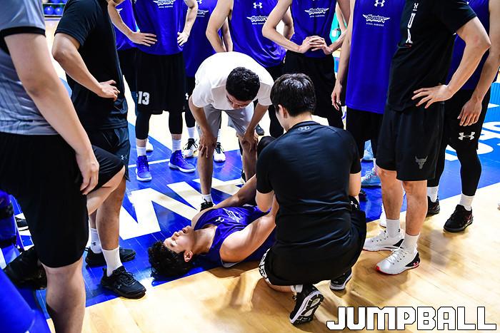 [점프볼=용인/박상혁 기자] 28일 용인에 위치한 삼성휴먼센터에서 열린 서울 삼성과 한양대의 연습경기, 삼성 장민국이 경기중 부상으로 코트 바닥에 쓰러져있다.