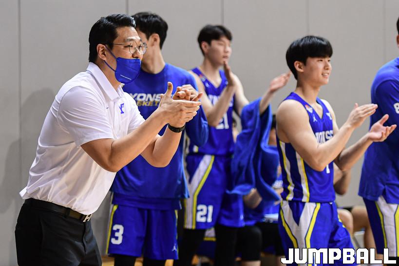 12일 연세대학교 신촌캠퍼스 체육관에서 열린 2022 KUSF 대학농구 U-리그 연세대와 중앙대의 경기, 연세대 윤호진 감독대행이 선수들을 독려하고 있다.