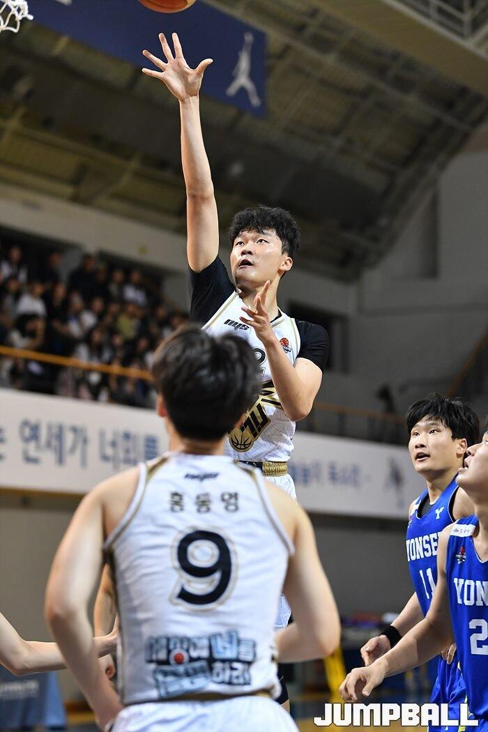 5일 연세대학교 신촌캠퍼스체육관에서 열린 2023 KUSF 대학농구 U-리그 연세대와 상명대의 경기, 상명대 최준환이 슛을 시도하고 있다. [점프볼=신촌/유용우 기자]