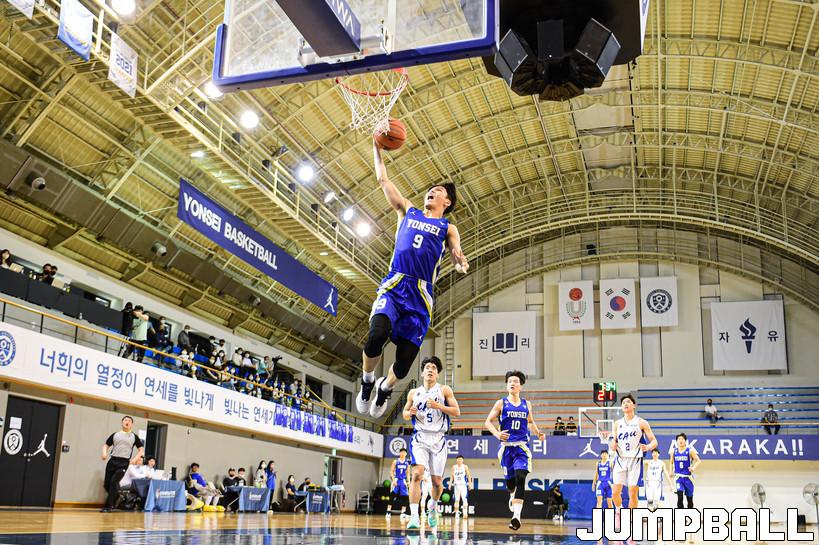 12일 연세대학교 신촌캠퍼스 체육관에서 열린 2022 KUSF 대학농구 U-리그 연세대와 중앙대의 경기, 연세대 신동혁이 속공 찬스에서 덩크슛을 시도하고 있다.