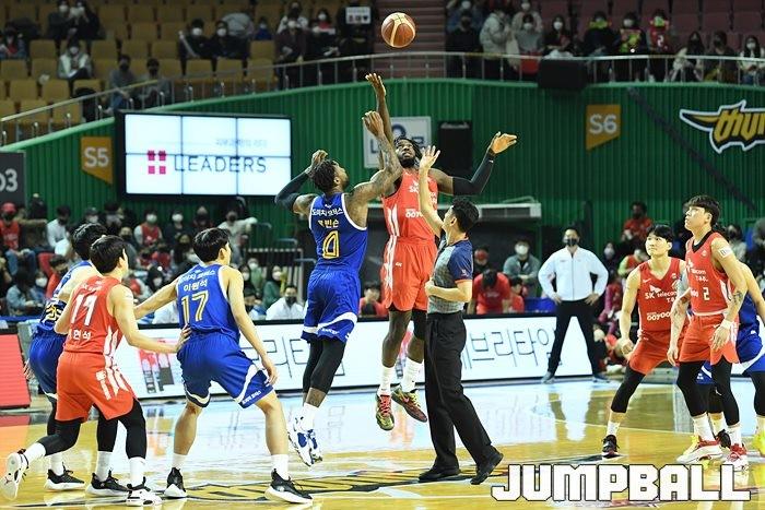 13일 잠실실내체육관에서 열린 2021-2022 KGC인삼공사 정관장 프로농구 서울 삼성과 서울 SK의 S-더비 4차전, SK 자밀 워니와 삼성 토마스 로빈슨이 점프볼을 하고 있다.
