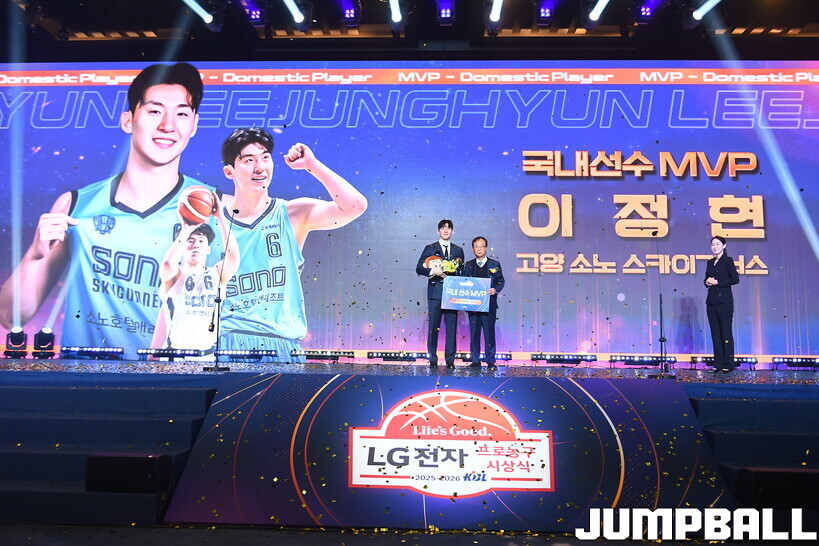 이정현은 9일 그랜드 인터컨티넨탈 서울 파르나스 그랜드 볼룸에서 열린 2025-2026 LG전자 프로농구 시상식에서 국내선수 MVP로 선정됐다. 기자단 투표에서 유효 투표수 117표 가운데 106표를 획득, 7표에 그친 유기상(LG)을 여유 있게 제쳤다. 베스트5에 선정된 5명 가운데에도 가장 많은 113표를 얻는 등 2관왕을 통해 올 시즌 최고의 선수라는 것을 공인받았다.